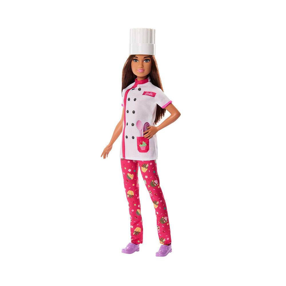 Always ready to try new recipes, she's dressed in her uniform, complete with a chef's jacket and hat. Also included is a sweet cupcake on a plate to serve her customers. Kids can dream big and imagine everything they can become with Barbie Career dolls! Doll cannot stand alone. Colors and decorations may vary.