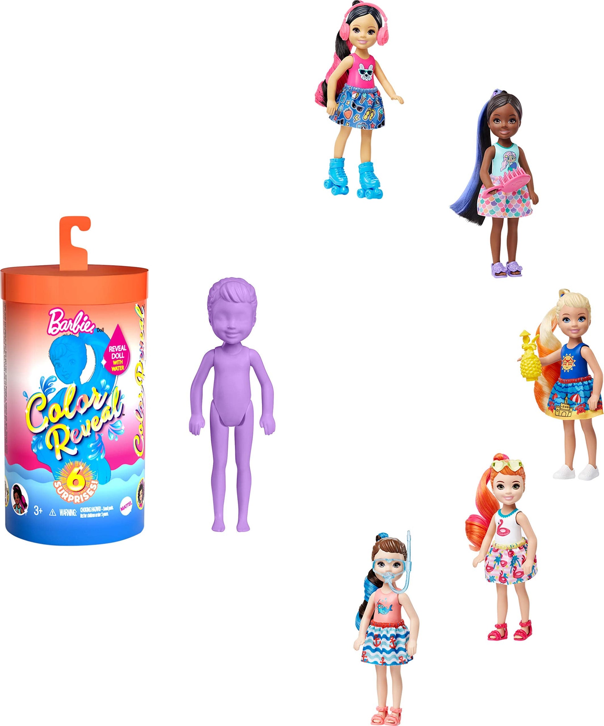 Barbie Color Reveal Chelsea Doll with 6 Surprises: Water Reveals Doll’s Look & Creates Color Change on Hair; 4 Mystery Bags Contain a Surprise Detachable Ponytail, Skirt, Shoes & Accessory