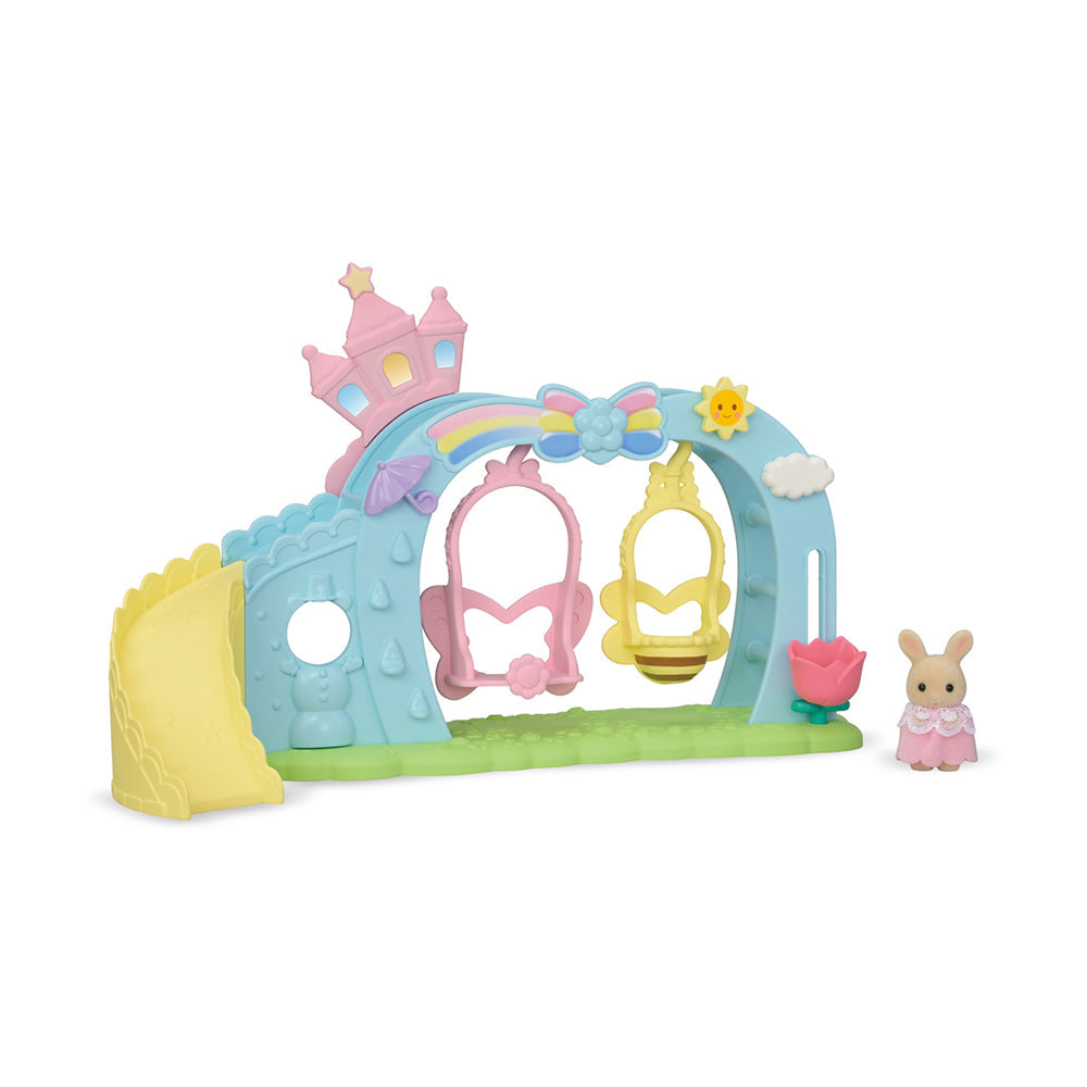 It comes with a Milk Rabbit cradled baby. The babies, including cradled babies, look like a butterfly and bee when they ride the swings. A cradled baby can ride the tulip lift up and down. The babies' faces look so cute peeping out through the snowman photo spot. There's also a rain drop bouldering wall, monkey bars and spinnable sun. Isla the Milk Rabbit cradled baby is always happy. Combine with the Sunny Castle Nursery, Rainbow Fun Nursery Bus, Nursery Sandbox & Pool, Nursery Friends and Flora Rabbit Family (sold separately) for even more fun. Combine with baby and cradled baby figures (sold separately) for even more fun, imaginative playtime!