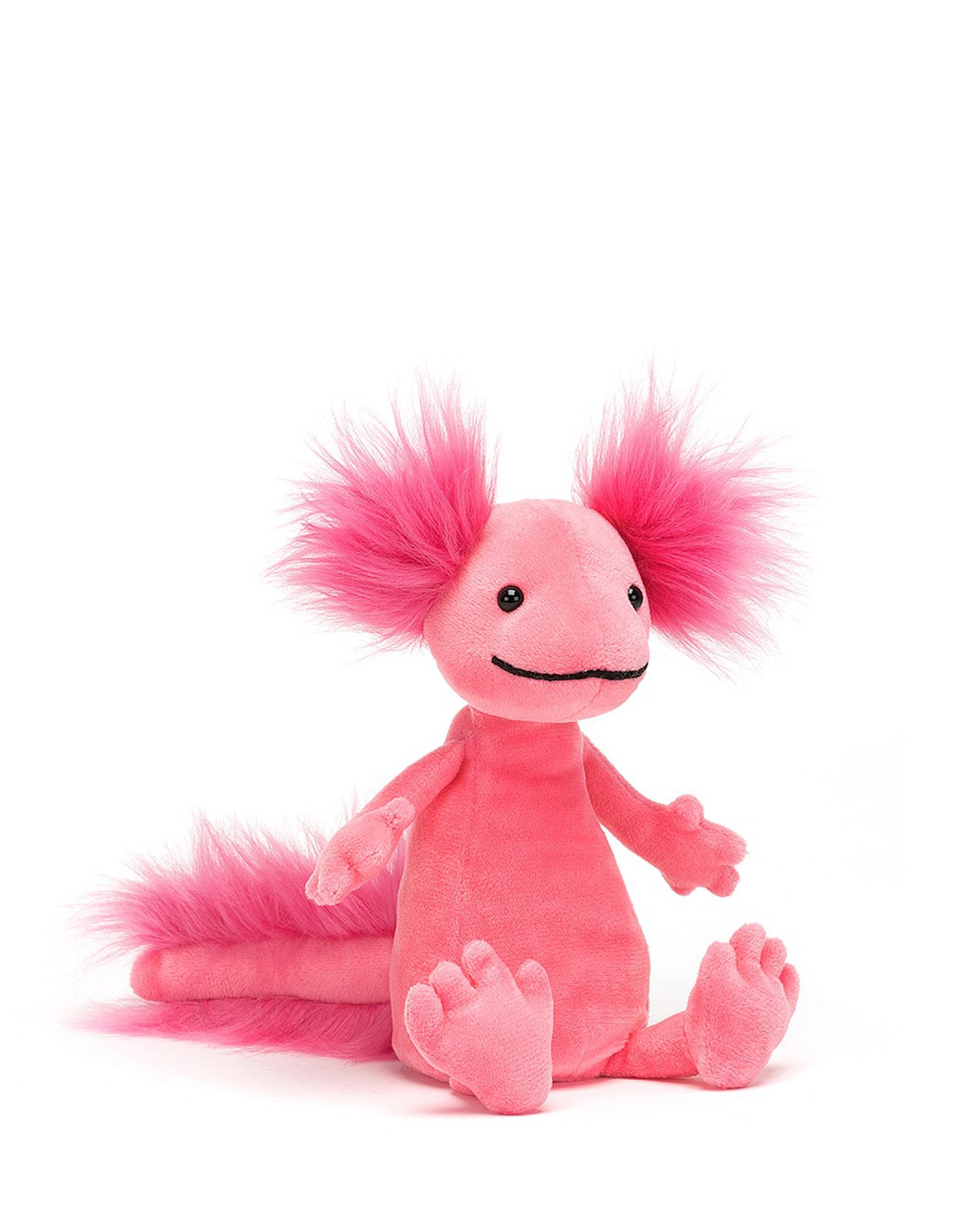Loveably luminous, Alice Axolotl is a whole lot of kooky in hot pink floof! This ambling amphibian is bubblegum-bright, with squidgy-soft feet, a goofy grin and a supercool long fuzzy tail! Alice waggles her tufty gills as she trots along the sea bed!