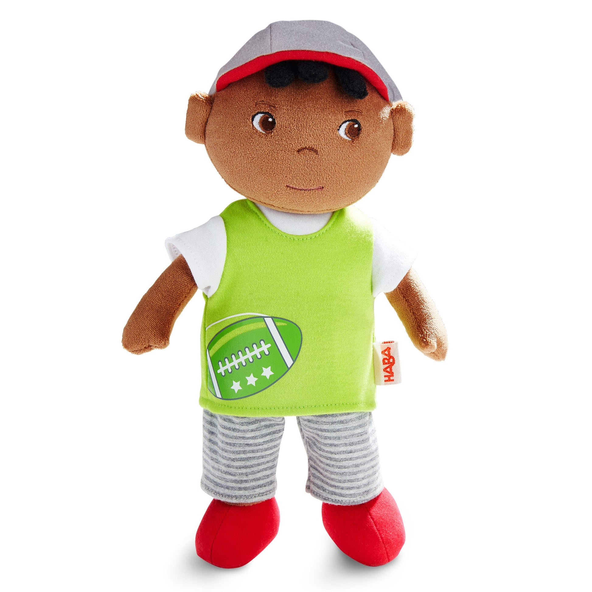 This sweet and sporty doll is ready to become a lifelong pal who is up for any outing. With extra soft filling and fluffy fabric, Mason is the perfect friend for love and snuggles. This quality-made doll is the perfect size to tuck into any bag for travel. Designed to be extra soft and soothing, this cozy fabric doll makes a delightful gift for all doll parents. Made of cotton and polyester, Mason measures 11.5" tall.